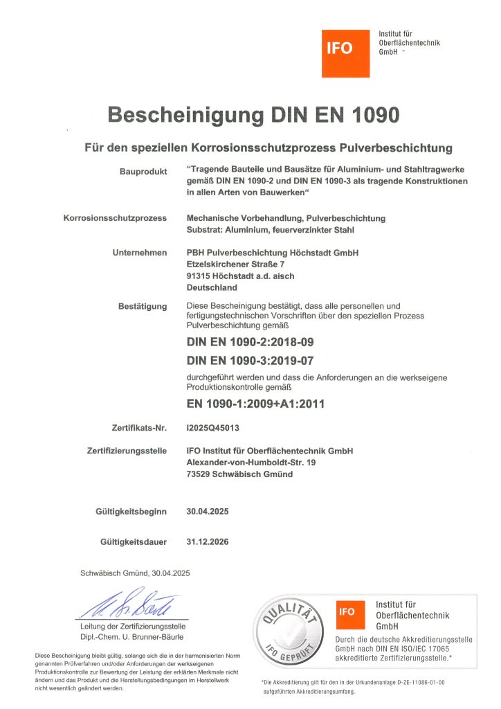 Diese Bescheinigung bestätigt, dass alle personellen und fertigungstechnischen Vorschriften über den speziellen Prozess Pulverbeschichten gemäß EN 1090-2:2018, EN 1090-9:2008 durchgeführt werden und dass die Anforderungen an die werkseigene Produktionskontrolle gemäß EN 1090-1:2009+A12011 erfüllt sind.